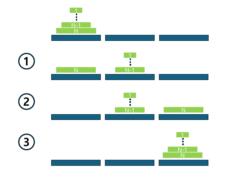 N 크기의 탑을 i위치에서 k위치로 옮기는 경우 1. N-1크기의 탑을 i에서 j로 옮긴다. 2. N을 i에서 k로 옮긴다. 3. N-1 크기의 탑을 j에서 k로 옮긴다. N=1 일시는 바로 i에서 k로 옮긴다. |